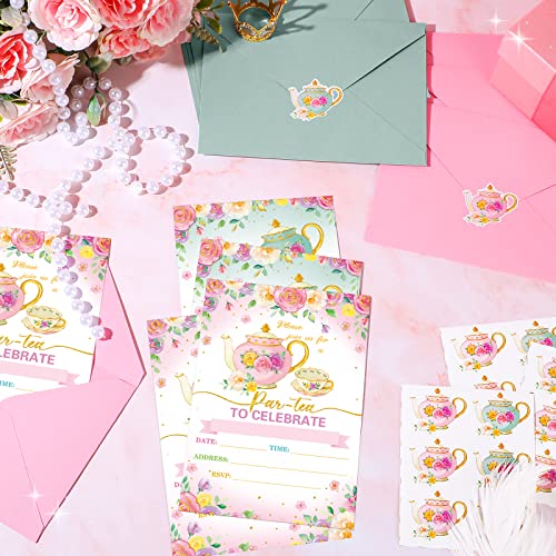 24 Pcs Tea Party Invitation Cards With Envelopes And Stickers, Little Girl Garden Tea Cup Time Bridal or Baby Shower Invite, High Tea Themed Ladies Event Ideas, Printed or Fill in The Blank Card